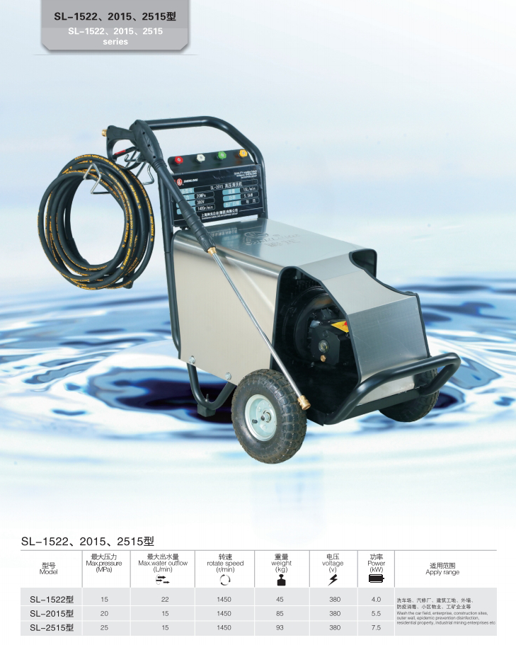 上海神龍集團生產的高壓清洗機SL-1522、2015、2515型高壓清洗機,適用洗車場、汽修廠、建筑工地、外墻、防疫消毒、小區物業、工礦企業等。