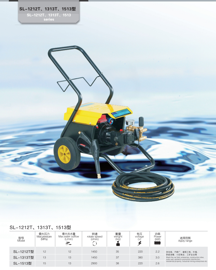 上海神龍集團生產的高壓清洗機SL-1212T、1313T、1513型清洗機,適用洗車場、汽修廠、建筑工地、外墻、防疫消毒、小區物業、工礦企業等。