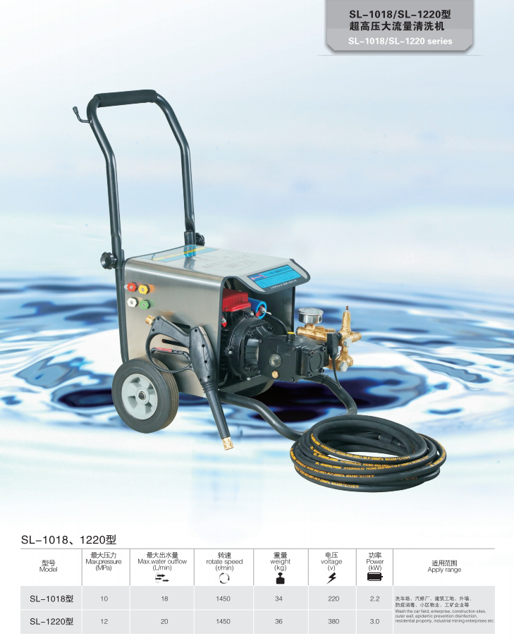 上海神龍集團(tuán)生產(chǎn)的高壓清洗機(jī)SL-1018/SL-1220型超高壓大流量清洗機(jī),適用洗車(chē)場(chǎng)、汽修廠(chǎng)、建筑工地、外墻、防疫消毒、小區(qū)物業(yè)、工礦企業(yè)等。